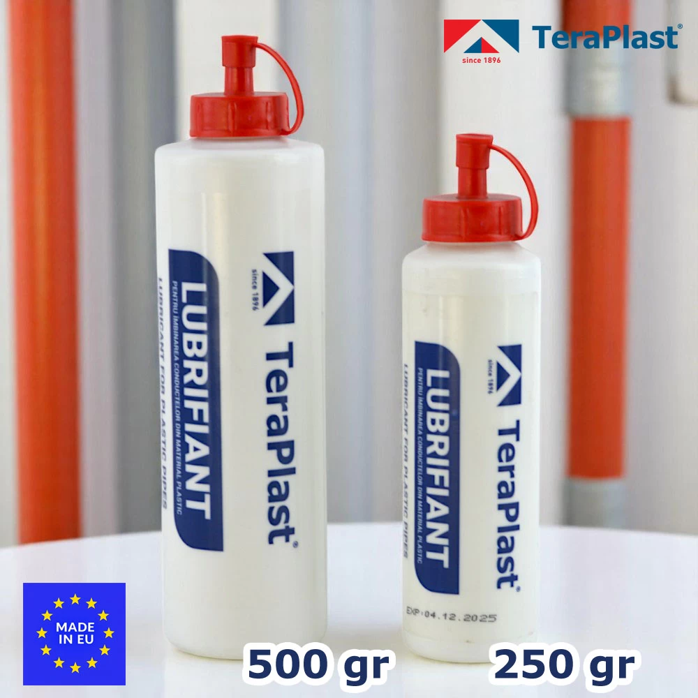 Descriere: Lubrifiantul pentru țevi PVC de la Teraplast, este un gel special conceput pentru montajul conductelor din PVC, facilitând îmbinarea elementelor (țevi, fitinguri, mufe cu garnitură). Acesta reduce frecarea la introducerea țevilor în mufă și protejează garniturile de etanșare. Este utilizat frecvent în instalații de canalizare, drenaj sau rețele interioare/exterioare. Caracteristici si beneficii: Specificatii tehnice: Avantaje: Modalitate de utilizare: 1. Curăță suprafețele (țeavă + mufă + garnitură). 2. Aplică un strat subțire și uniform de lubrifiant: 3. Introdu țeava imediat după aplicare. 4. Asigură alinierea corectă și împinge până la poziția finală. Observatii utile: 1. Nu înlocuiește adezivul pentru lipire (este doar pentru îmbinări cu garnitură). 2. Ideal pentru montaj rapid și fără deteriorări. 3. Se folosește frecvent în instalații sanitare și canalizare. Imaginile prezentate au scop informativ. Culoarea si textura produselor din magazin pot varia datorita procedeelor foto sau variatiilor de fabricatie ale producatorului.