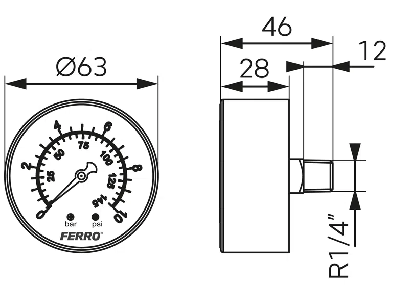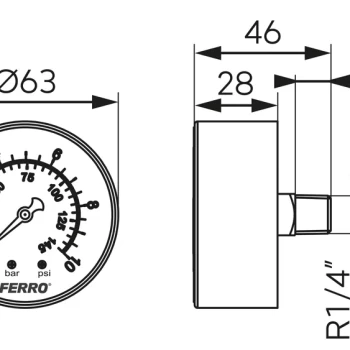 Manometrul axial de 63 mm, racord 1/4", domeniu 0–10 bari este un instrument mecanic utilizat pentru măsurarea presiunii în instalații de apă, aer sau alte fluide neagresive. Este prevăzut cu racord posterior (axial), ceea ce permite montarea directă în echipamente sau panouri.
