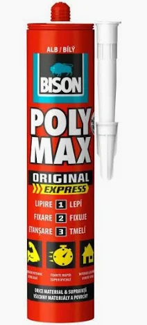 Adeziv și etanșant universal Bison Poly Max Original Express, alb, 425 g. Pe bază de polimer hibrid, oferă o lipire puternică și o etanșare rapidă pentru o gamă variată de materiale. Ideal pentru lucrări de montaj și reparații, atât la interior, cât și la exterior, asigurând o fixare sigură și durabilă.