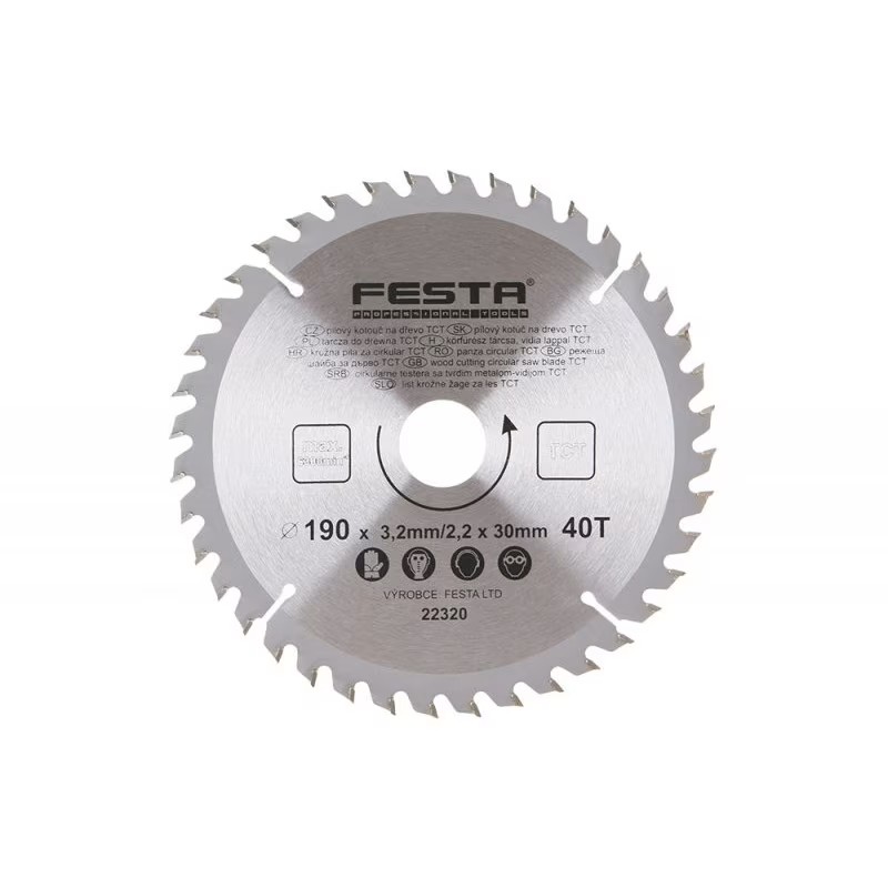 Disc circular profesional cu plăcuțe din carbură de tungsten (TCT – Tungsten Carbide Tipped), recomandat pentru tăieri precise și eficiente în lemn și materiale pe bază de lemn. Cu diametrul de 190 mm și 40 de dinți, este ideal pentru lucrări unde se cere un echilibru între viteză și calitatea finisajului.