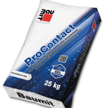 Descriere: Adezivul pentru polistiren si vata Procontact, este un adeziv mineral pulverulent pe bază de ciment pentru lipirea, şpăcluirea şi înglobarea plasei din fibră de sticlă pentru sisteme termoizolante. Produs verificat conform agrementului tehnic naţional şi în sistem, în conformitate cu ETAG 004 - Ghidul european de agrementare a sistemelor termoizolante. Element component al sistemului termoizolant: Baumit ProSystem. Acesta are o aderenţă foarte bună la suport, flexibilitate ridicată, lucrabilitate excelentă, permeabil la vapori, rezistenţă la şoc foarte bună, impermeabil, cu aplicare uşoară, manuală şi mecanizată.Se utilizeaza la lipirea plăcilor termoizolante pentru faţade din polistiren expandat EPS sau vată minerală. Masă de şpaclu armată pentru