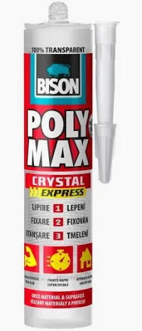 Adeziv și etanșant universal Bison Poly Max Cristal Express, transparent, 300 g. Formulat pe bază de polimer hibrid, asigură lipire puternică și etanșare rapidă pentru o gamă largă de materiale. Produsul este complet transparent după întărire, fiind ideal pentru aplicații unde aspectul estetic contează.
