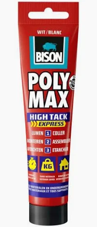 Adeziv și etanșant universal Bison Poly Max High Tack Express, alb, 165 g. Pe bază de polimer hibrid, asigură o lipire instantanee cu aderență inițială foarte mare („high tack”) și întărire rapidă. Ideal pentru montaj rapid și fixarea elementelor grele fără sprijin suplimentar.