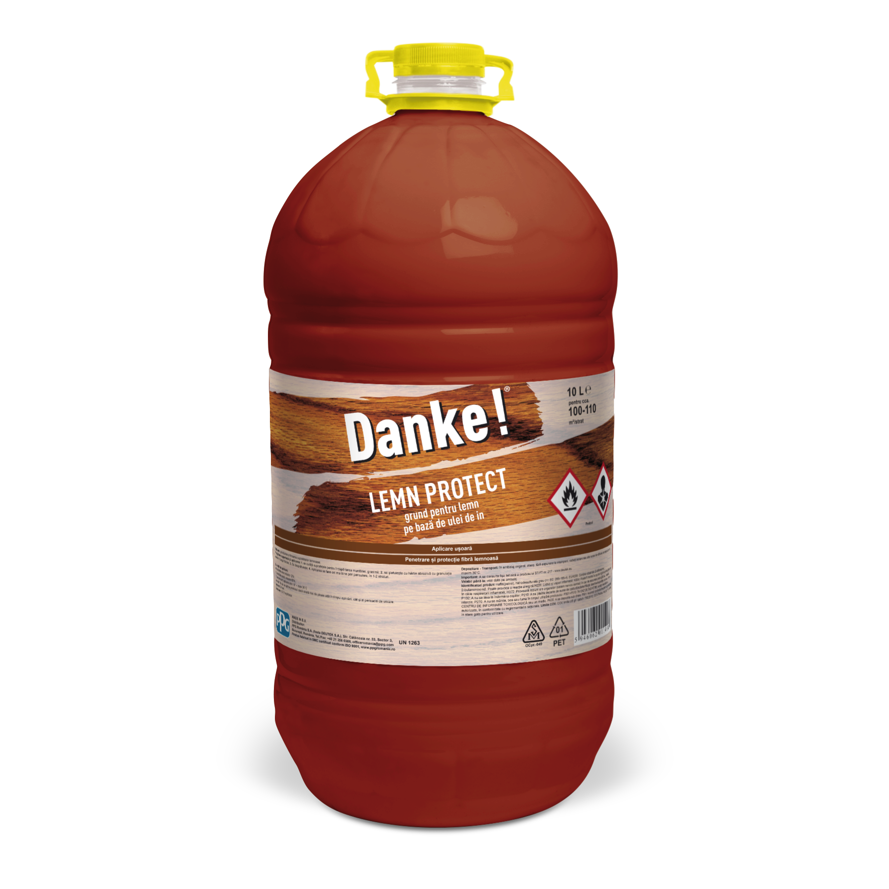 Descriere: Produsul peliculogen Danke lemn protect, este un grund de impregnare si de protectie a lemnului pentru interior si exterior.  Acesta se poate utiliza pentru toate elementele de constructie de lemn,placarile de pereti si tavane,usi,ferestre,etc. Aspectul produsului este unul lichid vascos si omogen,iar amestecarea acestuia cu alte produse nu este recomandata. Inainte de utilizare si in timpul punerii in opera, continutul trebui sa fie amestecat foarte bine.  Termenul de valabilitate este de 24 luni de la data fabricatiei, cu conditiile respectarii prevederilor de ambalare si depozitare. Specificatii tehnice: Imaginile prezentate au scop informativ. Culoarea si textura produselor din magazin pot varia datorita procedeelor foto sau variatiilor de fabricatie ale producatorului.Brand Danke Cu protectie la foc nu Numar de straturi recomandate 1-2 Consum 10ml/mp/strat Culoare transparent Cantitate 4l Dilutie nediluat Timp de uscare 24 Mod de aplicare pensula Temperatura de lucru 10-30°C Temperatura de depozitare 5-30°C Timp dupa care se aplica strat 2 48 Domeniu de utilizare exterior