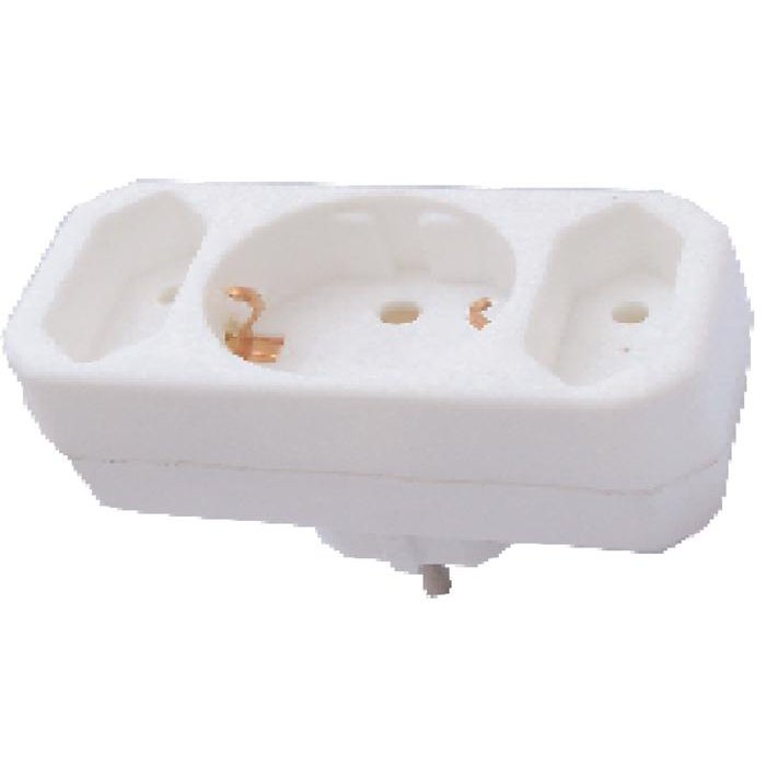 Adaptor electric tip triplu, cu un port Schuko (2P+E) și două porturi 2P (fără împământare), dispuse vertical. Este echipat cu protecție pentru copii, pentru o utilizare sigură în locuințe.