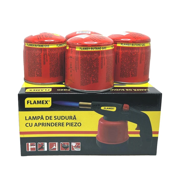 Lampă de gaz Flamex, echipată cu aprindere automată PIEZO, compatibilă cu butelii de 190 g. Este un instrument sigur și practic, ideal pentru lipire, încălzire rapidă, dezghețare și mici reparații. Designul compact și alimentarea cu butelie de unică folosință o fac portabilă și comodă pentru lucrări casnice sau profesionale.