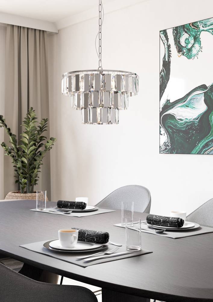 – Se montează pe tavan și devine un element central de decor datorită designului său rafinat