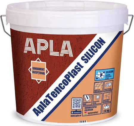 Tencuiala decorativa siliconica AplaTencoPlast structurata, cu aspect de scoarta de copac,pentru exterior pe bază de copolimeri acrilici în dispersie apoasă, granule de marmură naturală de diferite dimensiuni, pigmenţi, extenderi şi aditivi silicon.