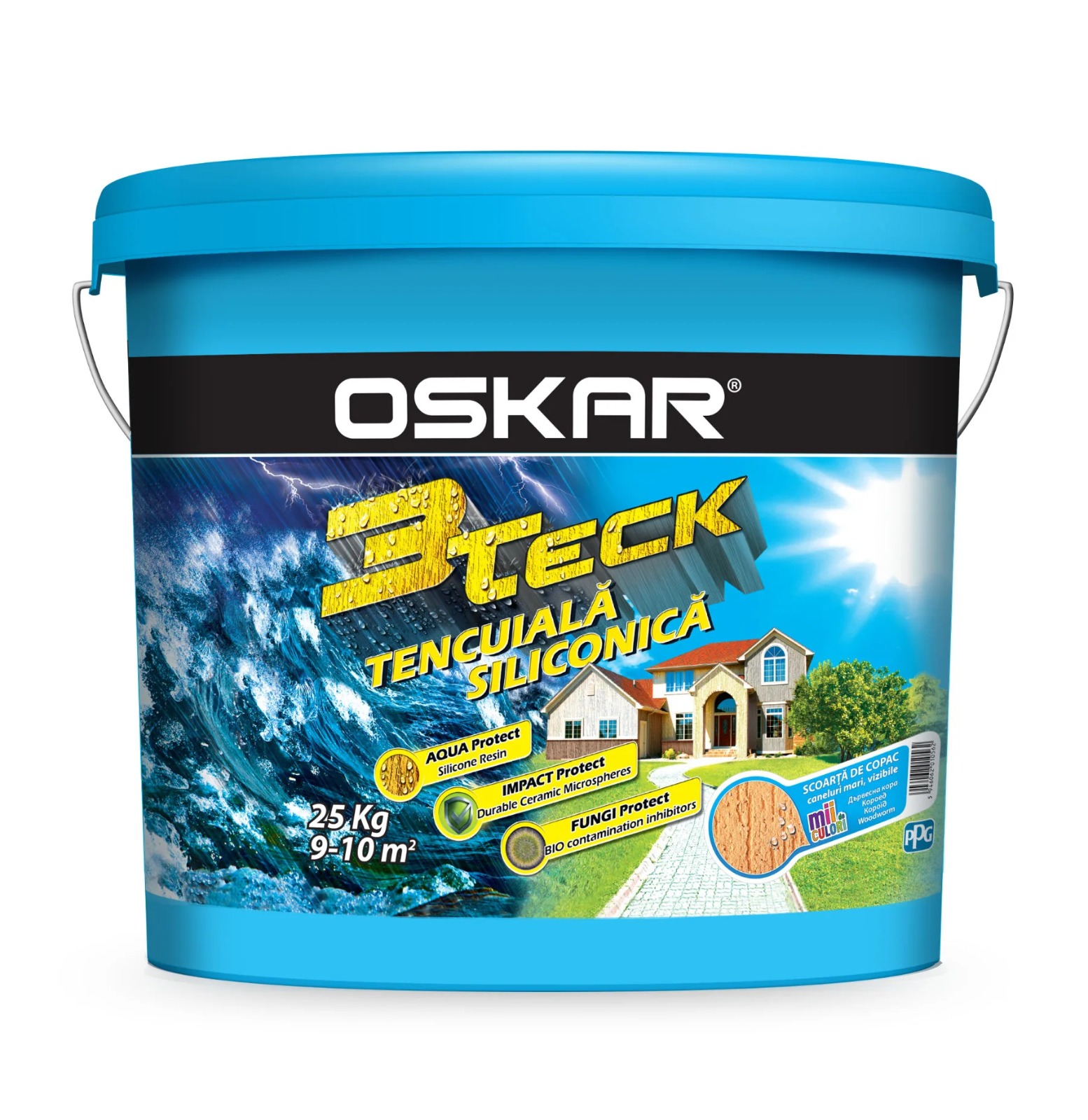 Descriere: Tencuiala decorativa Oskar 3Teck siliconica, dura cu aspect mat, structurat ce se utilizeaza pentru finisaje exterioare. Aceasta are la baza rasina acrilo-siliconica in dispersie apoasa aditivata cu microsfere ceramice si agregate